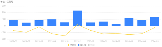 具体来说,5月份中资美元债券发行规模回升主要是因为阿里巴巴集团发行了一只规模50亿美元的债券“阿里巴巴” 0.5 2031-06-01,是年内融资最多的中资美元债券。