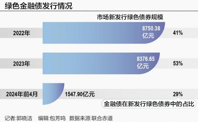 根据联合赤道统计数据,2022 年、2023 年、2024 年前 4 月份,市场上新发行的绿色债券规模分别是 8750.38 亿元、8376.65 亿元、1547.90 亿元;其中,金融债券的比例分别为 41%、53%、29%。