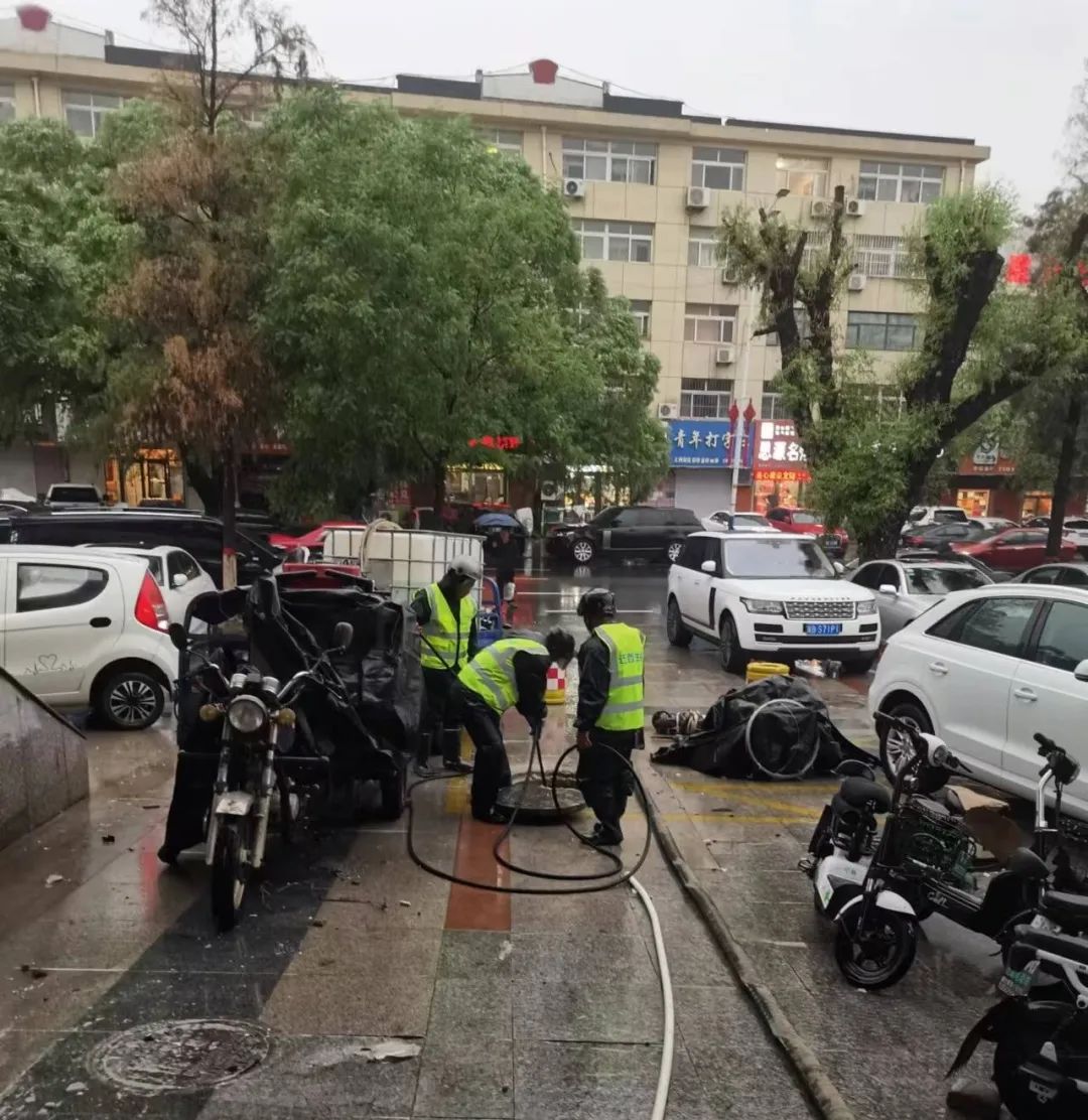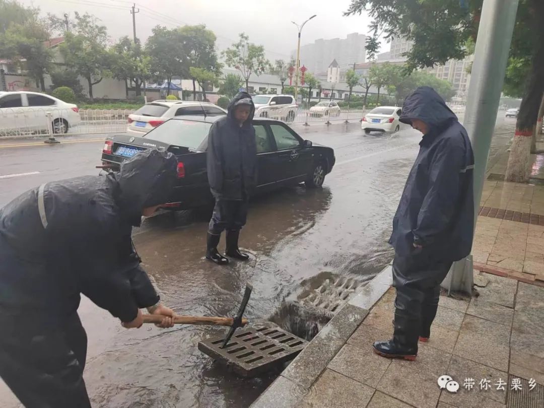 雨还在下,工作人员对长城路等重点部位进行检查,打开容易积水点的雨水,加快排水,保证出水口畅通,加快路面积水排放;对排水能力不足、积水严重的路段,应迅速安排应急救援车对路面积水进行抽水;检查周边山体、雨水泵站等防洪重点,防止雨天通行安全;检查绿化树木,防止断枝或树木倒伏伤害过路行人车辆。