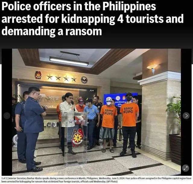据美联社6月5日报道,菲律宾官员当天表示,4名菲律宾警察因被指控绑架4名外国游客并勒索赎金被逮捕,案件受害者包括3名中国人。