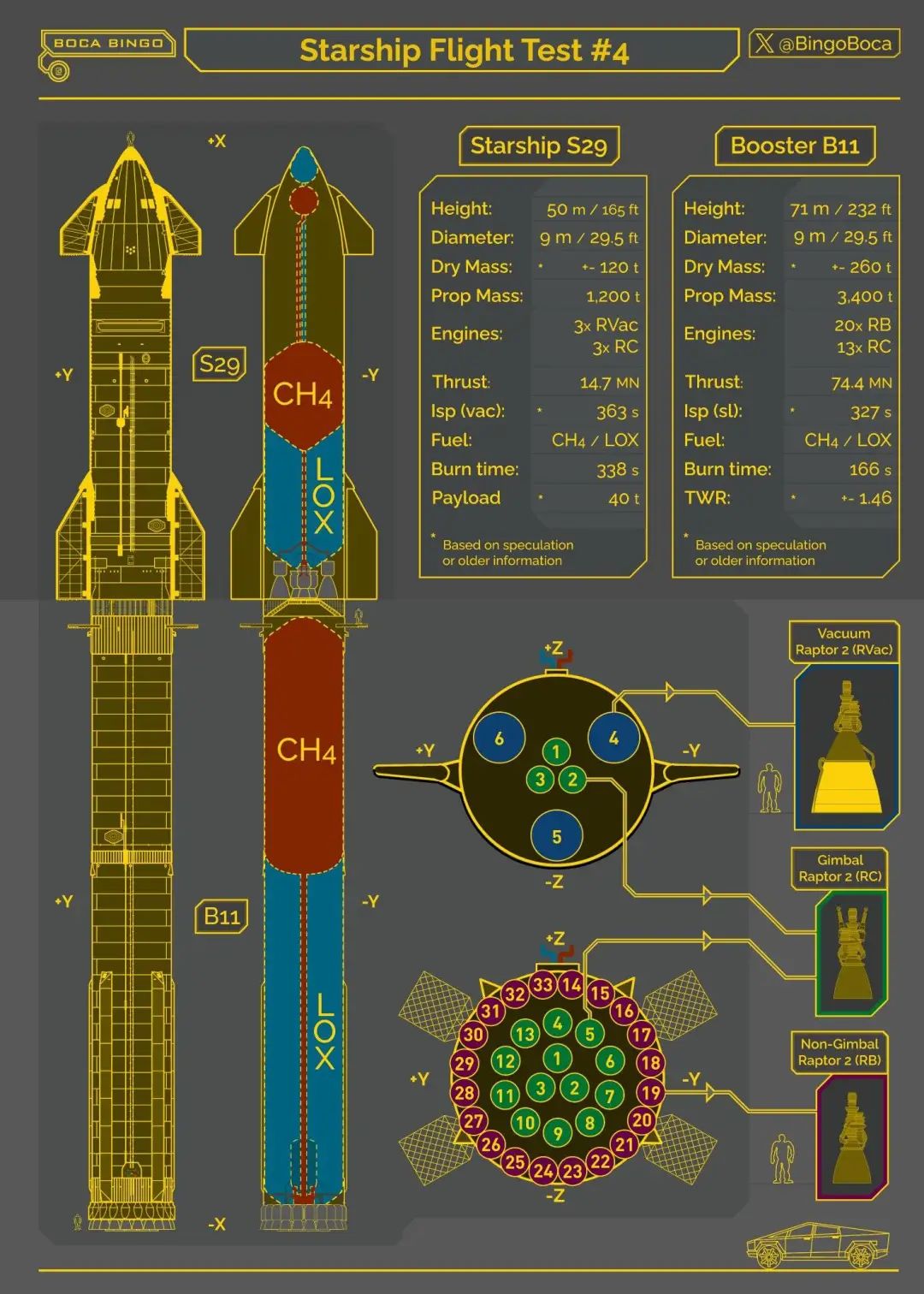 详细说明星舰第四飞的推进器和航天器. 图片来自:X@BingoBoca