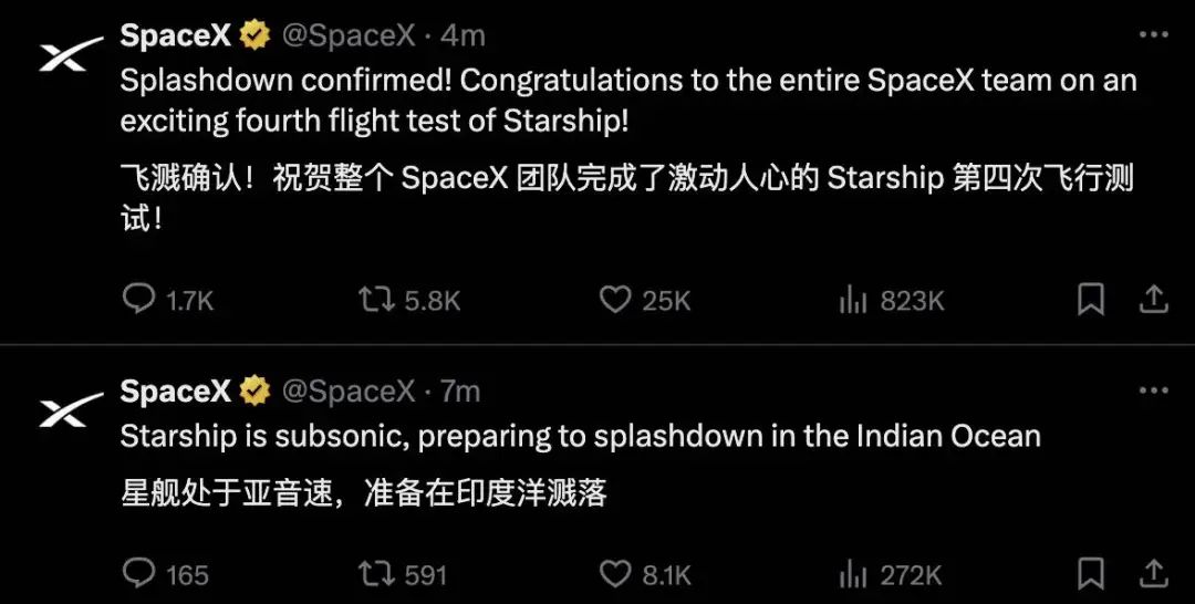 现场充满了欢呼声,散发着开香槟的气氛。SpaceX 还立即发文确认:第四次试飞顺利完成。