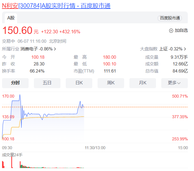 利安科技在发稿时上涨了432.16%,每股150.60元。