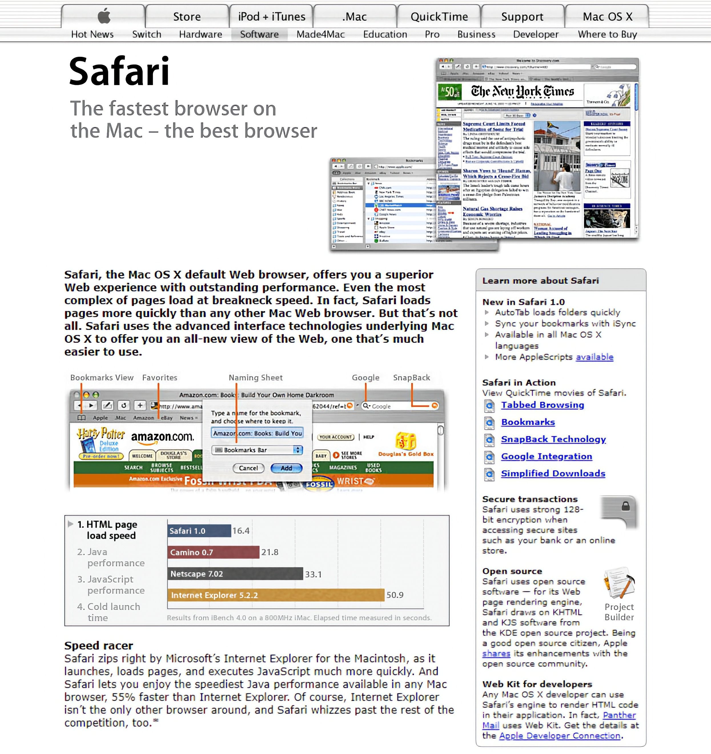 Safari浏览器最早可追溯到WWDC2003,苹果宣布推出Safari1.0版本。早期的Safari会占用大量的内存,这将导致计算机屏幕卡住,加上缺乏兼容性和各种插件支持,使得其口碑越来越差。