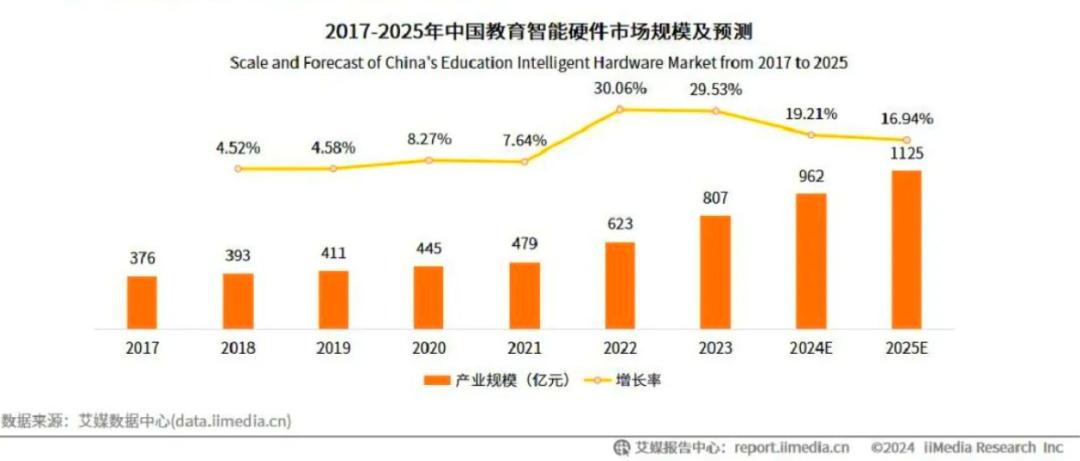 根据艾媒咨询数据,2017~2023年,中国教育智能产品市场总体规模呈上升趋势。其中,在“双减”政策出台后的第二年(2022年),中国教育智能产品市场规模开始大幅增长,2023年总市场规模达到807亿元,同比增长29.53%。艾媒咨询还预测,2025年中国教育智能产品市场规模将超过1000亿元。