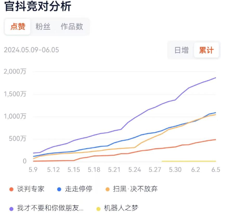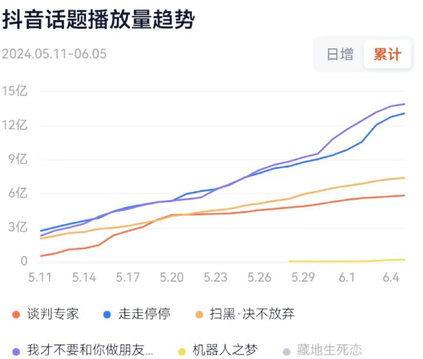 而且从抖音渠道的宣传热度来看,“我不想和你做朋友”官抖累计点赞近2000万,累计话题播放量近14亿,在抖音的人气领先范围较大,最近《走走停停》的人气增加了不少,与《扫黑:永不放弃》《谈判专家》一起分列二至四位。