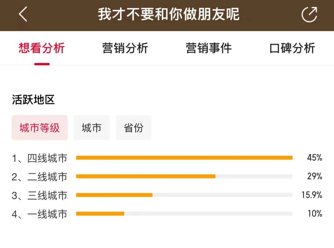 一是常规喜剧元素充足,属于本次端午节期间的硬通货;二是下沉宣传到位,其颤音热点话题和官方颤抖点赞领先。猫眼想看用户画像,说明四线城市想看客户的比例已经达到45%,其他国产电影都在30%。 上下,差别较明显;第三,这也是档期内唯一一部以青春为主题的电影,有希望在暑假前承担很多观影情感需求。