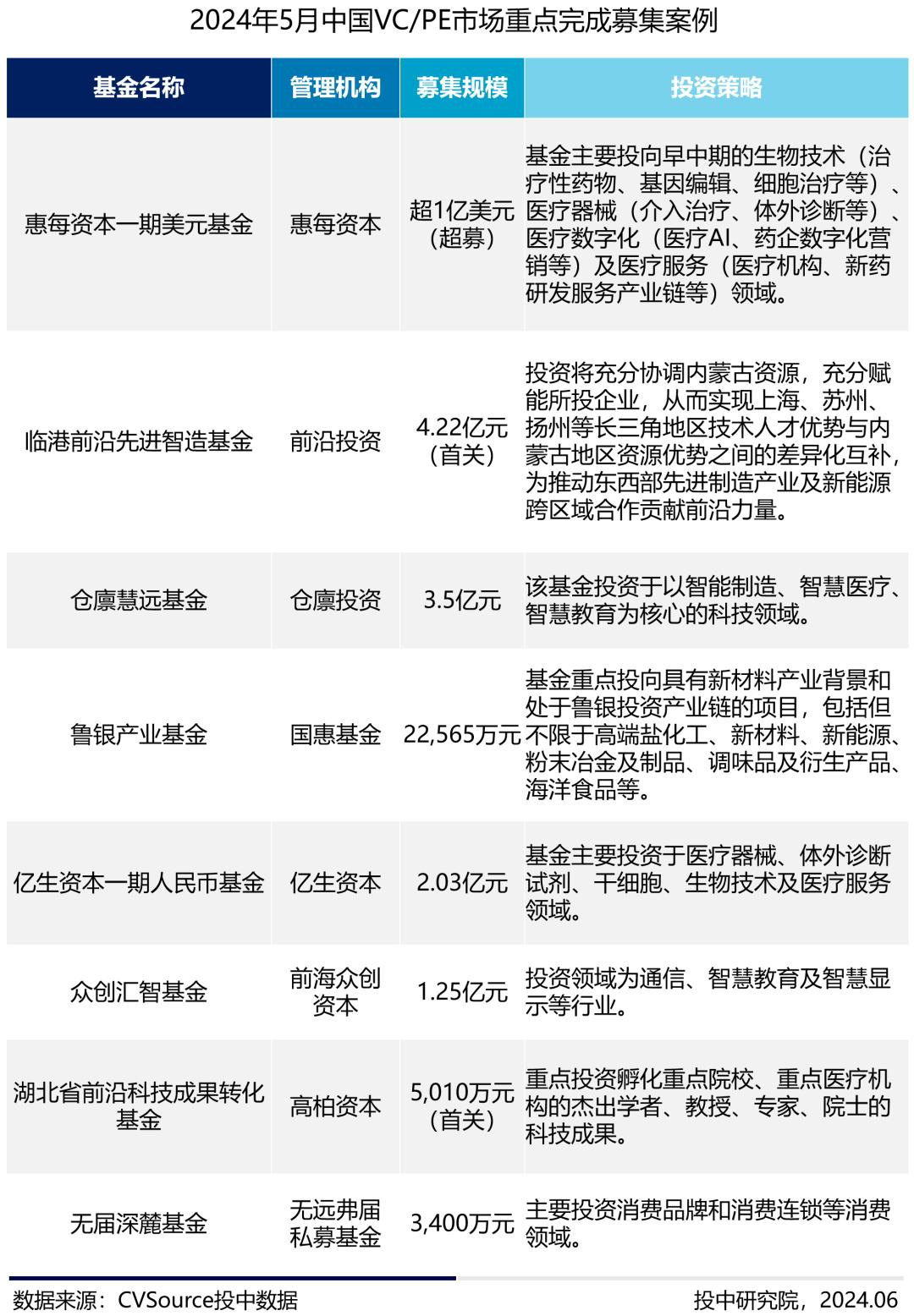 2024年5月,本期融资案例的投资方向集中在生物医药和智能制造领域。惠每资本一期美元基金超额募集,规模超过1亿美元,是本期募集的最高值。