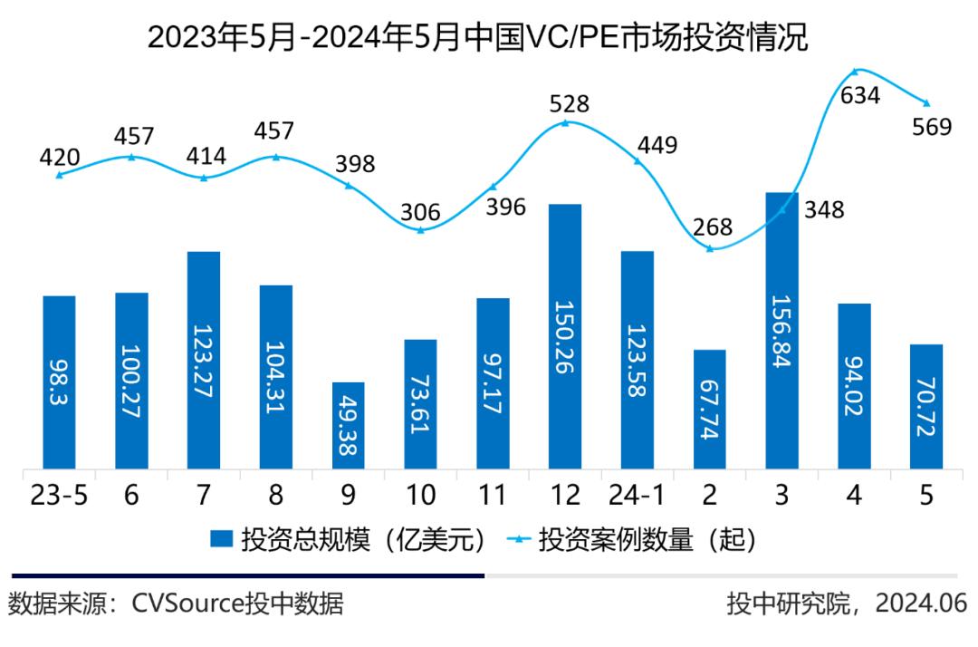2024年5月,投资案例数量569起,环比减少10.25%,投资总额70.72亿美金,环比减少24.78%,投资市场呈下降趋势。