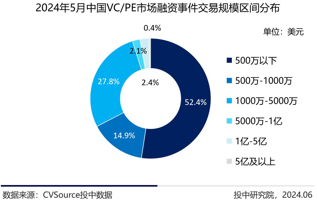 2024年5月,天使轮和A轮融资交易总量占市场交易总量的比重。超六成,超过A轮交易规模18亿美金,占市场总量26.1%。与去年相比,A轮投资总额和比例略有下降。PE阶段融资交易总额占市场交易总量的比重。21.4%,与去年同期相比,14.6%的比例有所上升。