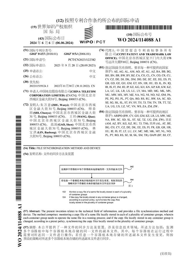 中国电信公布国际专利申请:“文件的同步方法和设备”