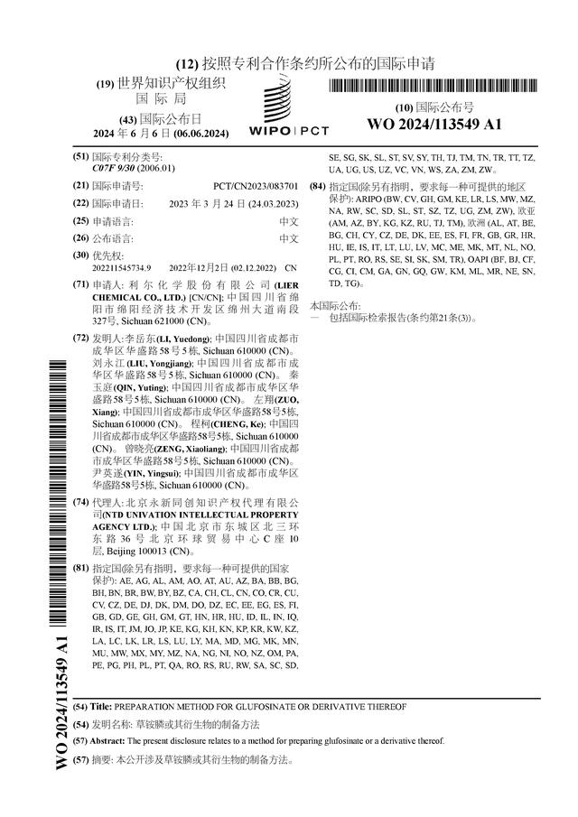 利尔化学公布国际专利申请:“草铵膦或其衍生物制备工艺”
