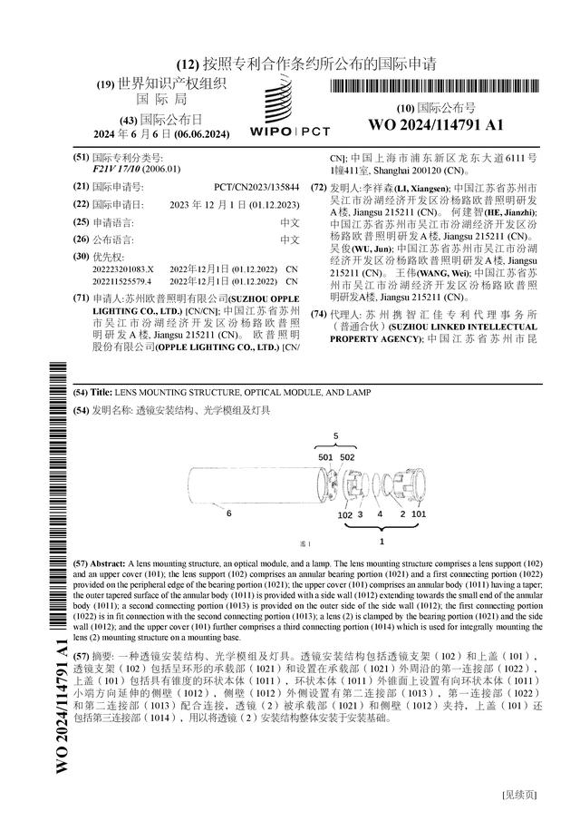 欧普照明公布国际专利申请:“镜片安装结构,光学模块和灯具”