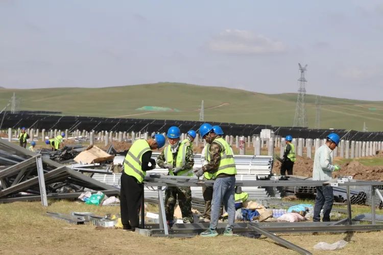 6月5日上午,在霍林郭勒高新技术产业开发区100MW复合光伏工程施工现场,数十名工人正在运输和组装一排排安装好的光伏板上的光伏支架。另一方面,工作人员正在使用工程车辆配合在打开的运河中发放电缆。目前,该项目已进入尾工阶段。