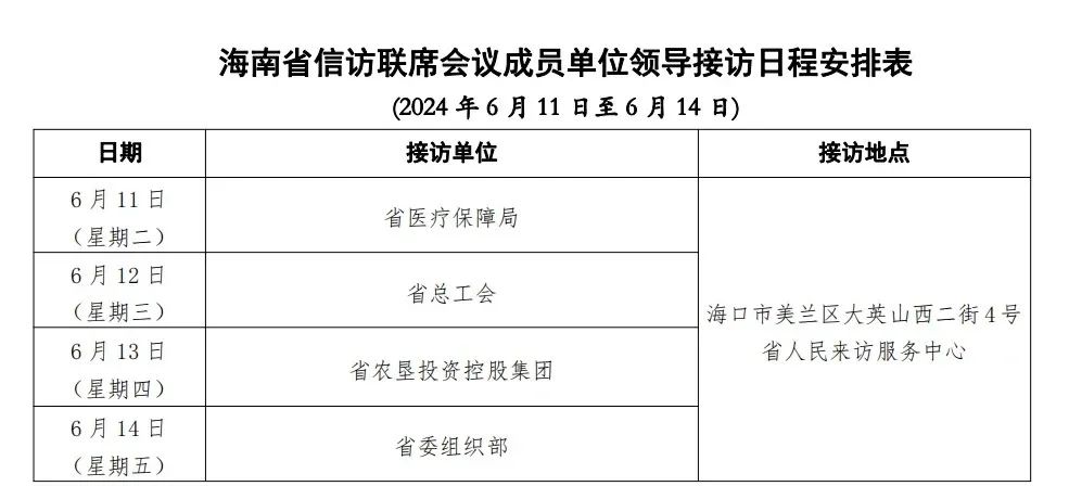 海南省直属单位领导接访日程已于6月11日至14日公布。详情(来源:南海网)