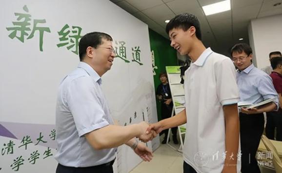 2017年8月,清华大学新生入学,时任校长邱勇与庞众望握手交谈。