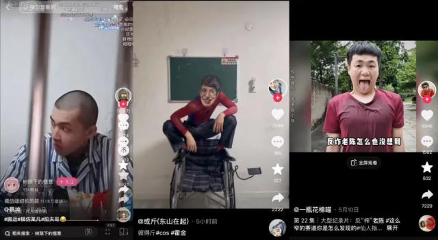 因此,在短视频平台上,模仿主体不再局限于那些有实力登上模仿秀舞台的人,而是普通人;模仿的目标不再只是明星,而是扩展到网络名人、企业家等各种人群;模仿不再是唱歌、拍戏等一系列表演。而是“玩梗”“整活儿”:“科比圣体”在直播间表演“肘击”、“吴亦凡圣体”在直播间踩缝纫机,“反诈小陈”在短视频中伸出舌头锻炼身体…