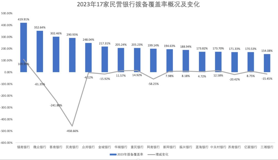 同时,个别银行也出现了较大的调整。公布数据的17家民营银行中,有9家明显下降。温州民商银行幅度最大,从2022年的749.59%下降到2023年的290.93%。客商银行也大幅下降,2023年拨备覆盖率下降241.80个百分点至302.46%。