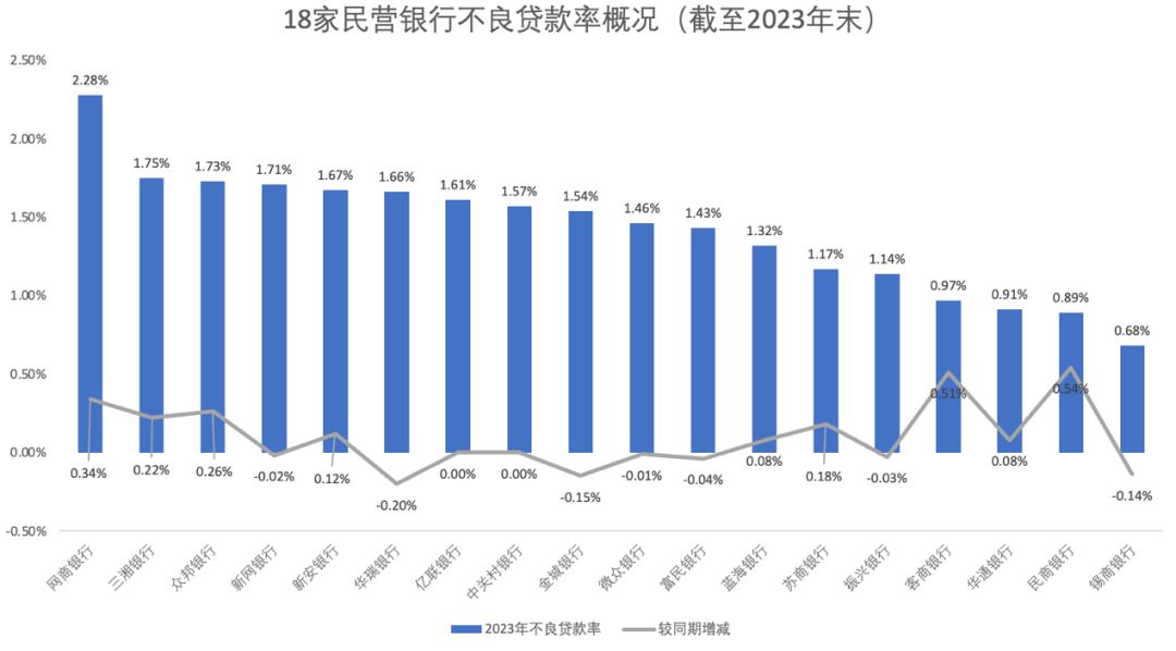 同时,今年民营银行平均不良贷款率也有所上升。根据金融监管总局的数据,今年第一季度末,民营银行不良贷款率为1.72%,较2023年第四季度增长0.17%。