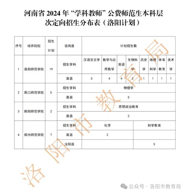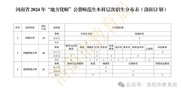 河南省地方公费师范生培养计划分为五类实施,共招生4081人。洛阳市有161人。