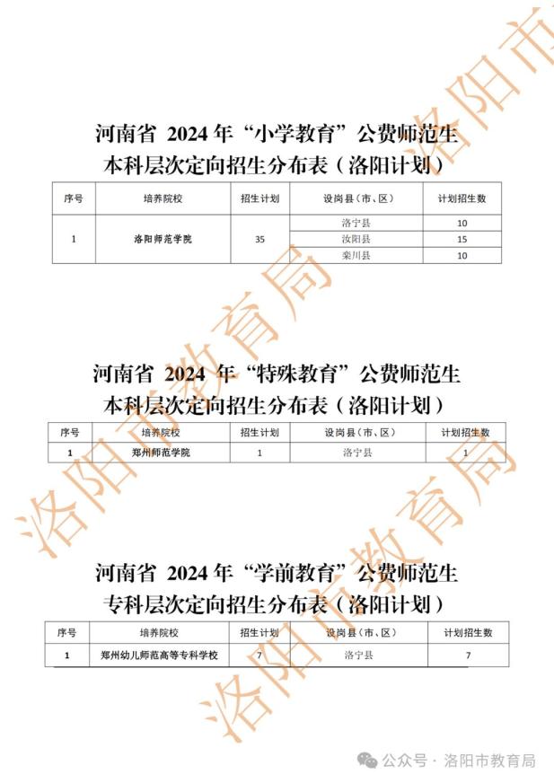 (三)“小学教学”地方公费师范生全省计划招收569名本科“小学教学”地方公费师范生,培养农村小学、教学点教师,实施综合培训。当时各培训院校对当时批准的一般招生人数进行统筹规划,均为师范类,计划类别为地方公费师范生,其中洛阳市计划招收35名“小学教学”地方公费师范生。