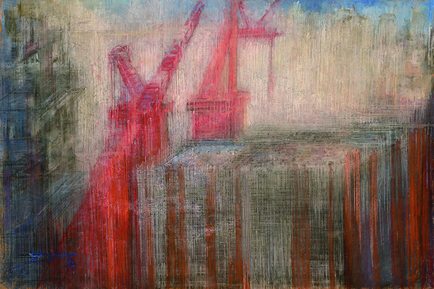 杨启恒的作品以其华丽的画面结构和完美细致的画笔,展现了城市的繁荣和活力。徐君华的城市系列以橙黄色、海蓝色和桃红色丰富的色块、亮点和线条象征着城市的活力和节奏,而石峻丞的作品•1933年以前的远东第一大屠宰厂、今天的老场坊上海文化创意产业园为对象,以巧妙叠加的灰色色调揭示了复杂的立体结构。又点缀着明亮透明的光点,象征着城市的巨大变化。钟锦芳的作品《平凡的一天》以其细腻的笔触和微妙的光影变化,捕捉到了城市清晨的美好瞬间,展现了城市生活的平凡与温暖。