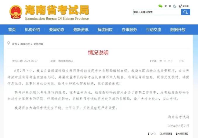6月7日,海南省考试局表示,6月7日上午,海南省在常规高考语文科目开考前发现考生条码编制不正确。该局立即启动应急处置程序,并要求监考人员指导考生在当天考试中认真填写姓名、准考号码等信息,并在现场反复核实,确保信息正确。这件事引起了社会的关注,给考生和家长带来了疑惑,表示歉意!