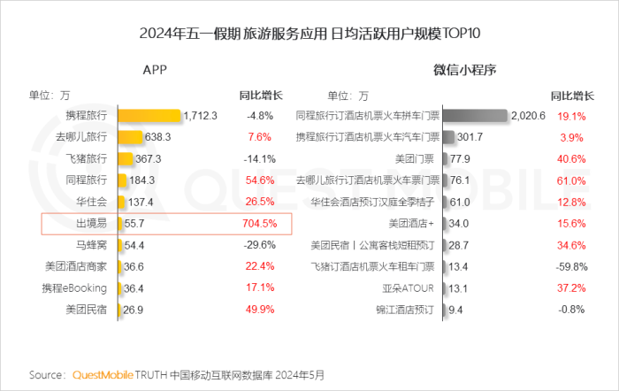 QuestMoblie 发布的《2024 五一假期洞察报告》显示,整体旅游市场呈现火热态势,多个旅游服务平台较去年五一假期流量增长明显;其中出境游市场持续复苏,出境易 App 用户规模较去年同期飙升七倍。