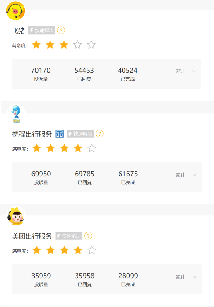 在黑猫投诉平台搜索各知名在线旅游平台,会发现消费者在旅游出行消费中的不满多集中于退款、扣费、改价这类环节。但不同的是,相比携程和美团较高的投诉回复率,7 万多条投诉案例中,飞猪回复了多 5 万条。