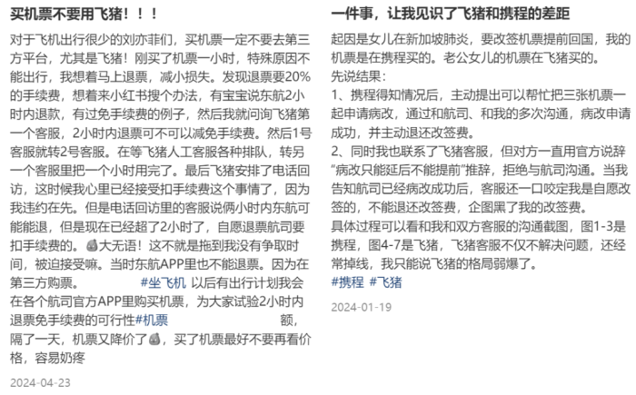 我们可以在许多社媒的消费者反馈中看到关于售后服务的“拉扯”。在小红书中搜索“飞猪”,能看到在不同消费环节出现问题的消费者,都表达了对飞猪客服效率和解决能力的质疑。