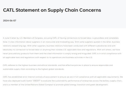 对此,在声明中,宁德时代否认了上述联名信的指控,并提到联名信以不准确、误导的方式引用了供应商信息。