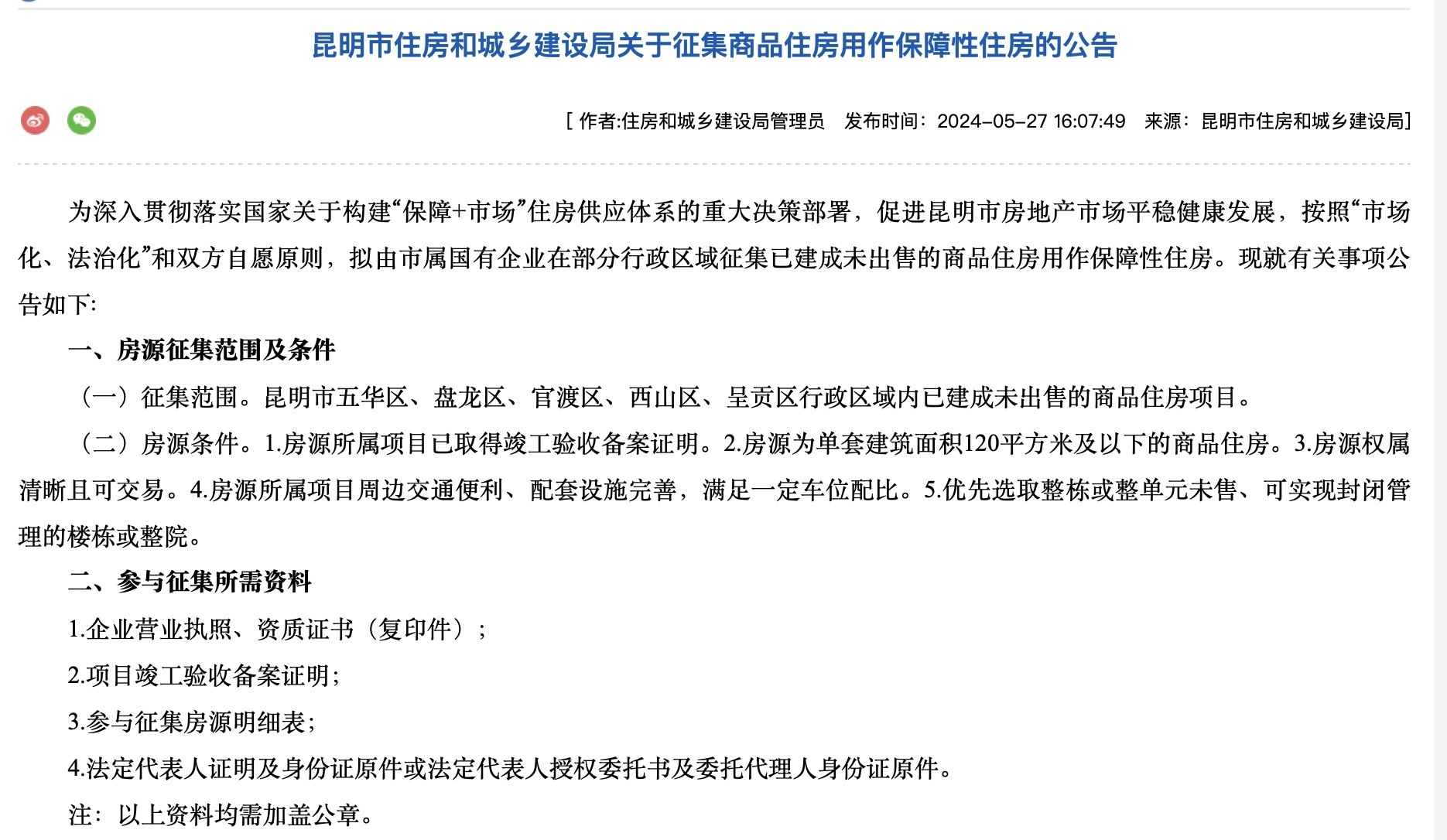 政策明确后,各地纷纷效仿。5月15日,杭州临安区发布公告,计划在该地区收购一批商品房作为公共租赁住房,被业界视为“第一枪”。;27日,昆明公布了更详细的收储计划,计划由市属国有企业选择已建成未售出的商品房作为保障性住房。