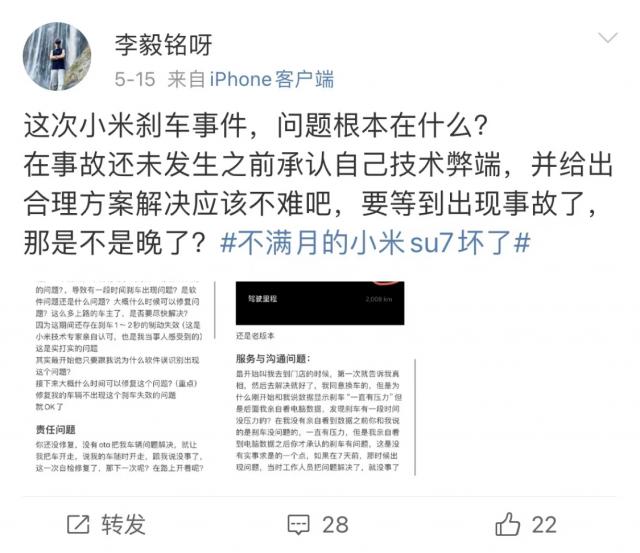 5 月 8 日本,一个小米在湖南的兖阳。 SU7 车主李先生,遇到了“刹车故障”。