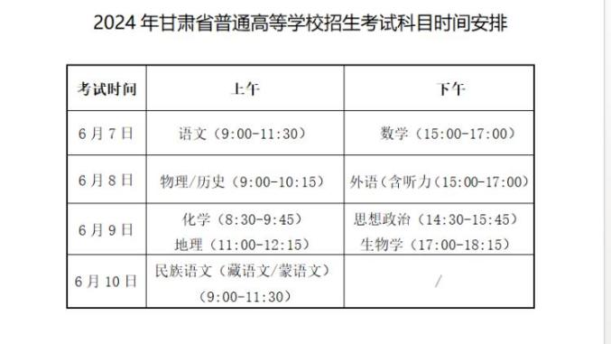 六月五日,甘肃省教育考试院发布的《2024年甘肃省普通高等学校招生条例》明确规定,普通高考将于六月七日至十日举行,高考成绩将于六月二十五日上下公布。省内各批次各类录取分数线一次确定,一次公布。第一次志愿填报时间为6月26日20日:00至6月30日14:00,第二次填报时间为7月29日20日。:00至7月31日14:00。普通高考招生7月6日开始,8月15日结束。