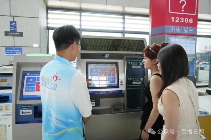 志愿者为旅客提供现场连接、旅游咨询等志愿服务,并在高铁出站口贴心送上日照旅游推荐册。