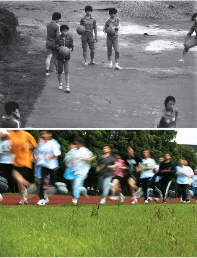一九九二年的学生在学校的空地上锻炼身体,现在的学生在现代橡胶跑道上锻炼身体。