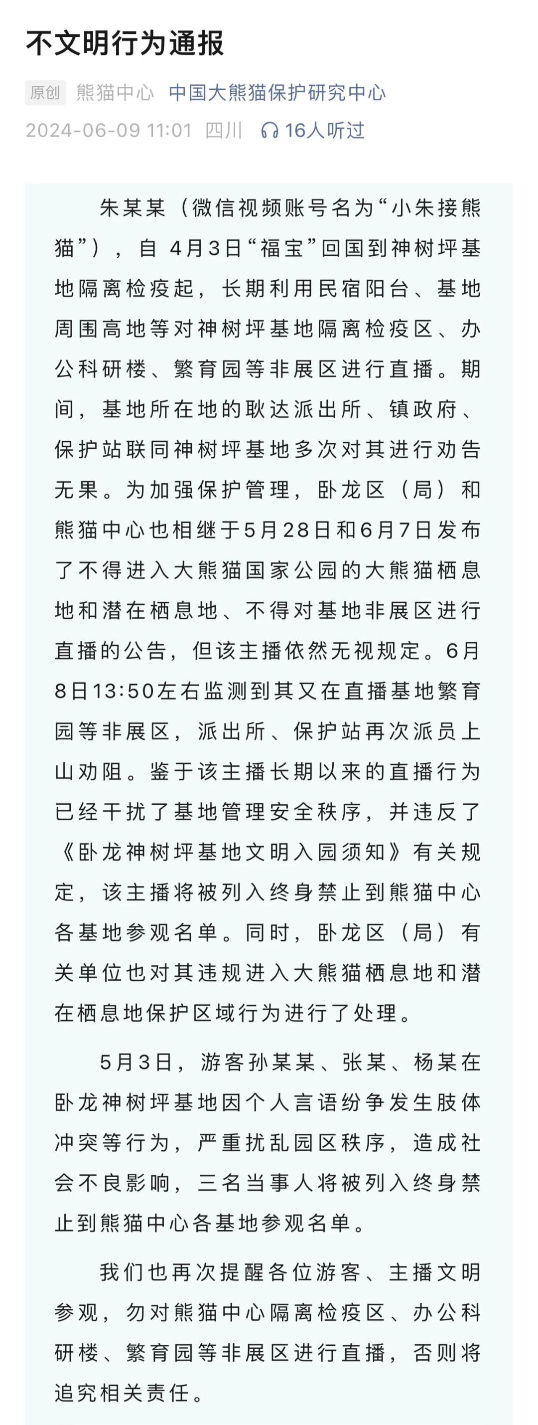 九日,根据中国大熊猫保护研究中心的最新通知,朱某某(微信视频账号名为“小朱接熊猫”), 4月3日,“福宝”回国对神树坪基地进行隔离检疫,并长期使用B&B阳台和基地周边高地直播神树坪基地隔离检疫区、办公科研楼、养殖园等非展区。