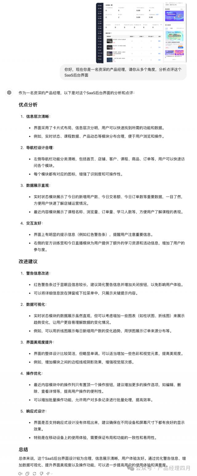 你看,我上传了一张鹅通的照片。 SaaS 后台界面,只使用简单的提示,GPT 1 在几分钟内给出了优势分析和改进建议。