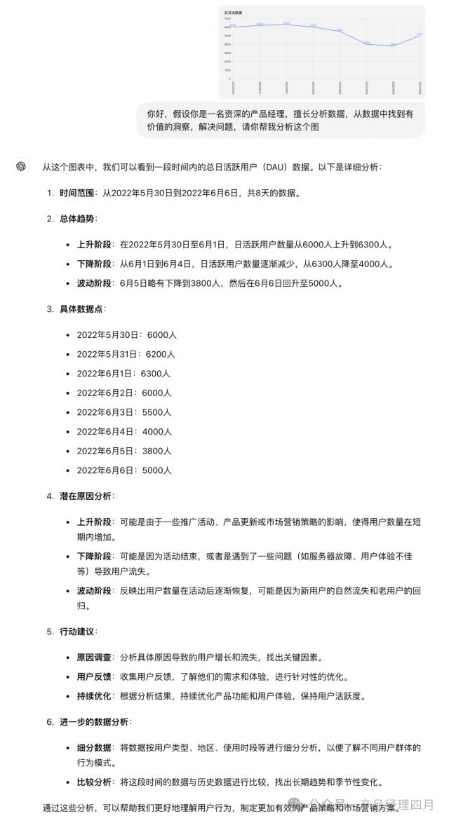 您看,我发了一张日活数据折线图,它能准确地看到数据下降的地方,并给出可能的原因分析和行动建议。