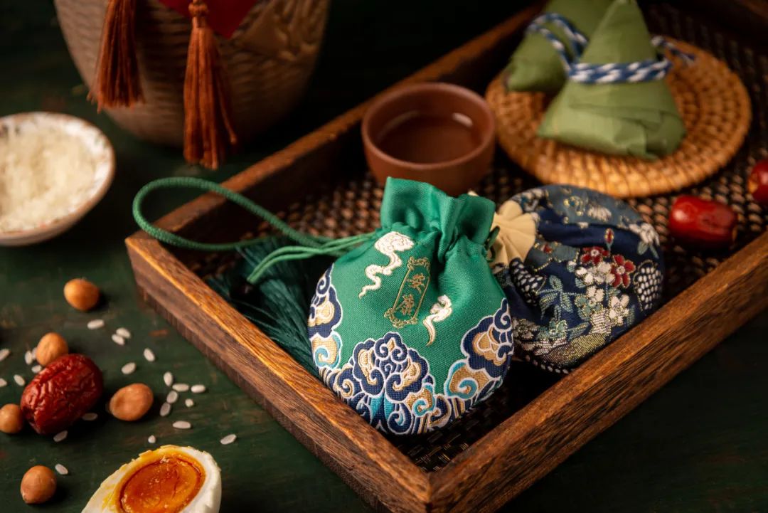端午节期间,孩子们戴着香囊,这背后有辟邪驱瘟的传说。在古代,人们认为生病是因为妖怪上身,而香囊中的朱砂、雄黄、香药等成分被视为具有驱邪作用。香囊不但外包用丝布,使其清香四溢,还用五色丝弦扣成索状,做成各种形状,精致精致。另外,香囊也是用来装饰裙子的,但是在一些南方城市,年轻男女也是通过赠送香囊来表达彼此的爱。