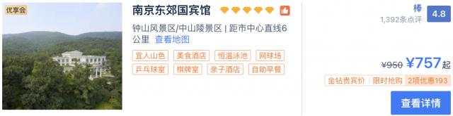 南京东郊国宾馆豪华房2晚(第一晚含早,第二晚不含) 下午茶 免费观看(电影院同步),1099元;南京国宾馆。