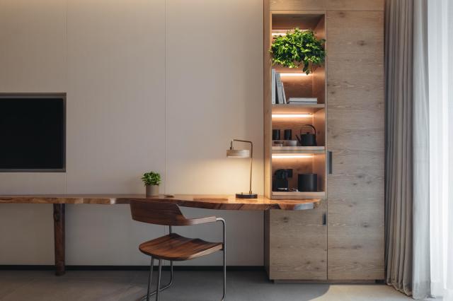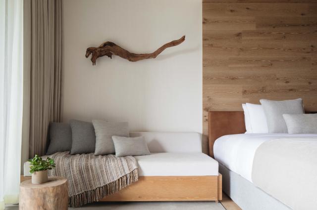 房间里到处都是细节。木质房卡、纸质衣架、可回收木质笔记本、回收瓶专用水杯。阳台上的椅子是一个圆木桩,上面可以看到年轮。