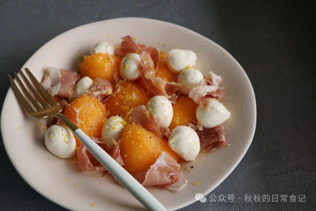 夏季沙拉灵感:哈密瓜,意大利火腿 prosciutto、新鲜的马苏里拉奶酪或布拉塔 burrata、柠檬片,盐花