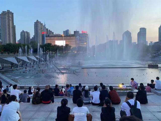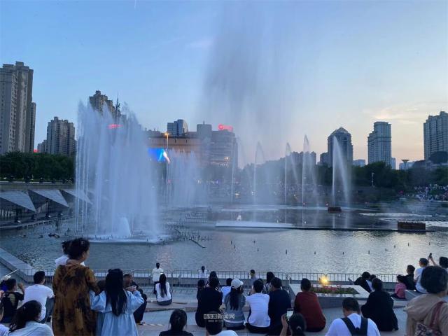 10 日夜,是端午节假期的最后一次,群力金河公园的音乐喷泉表演正在进行。 7:20 正式开始。微风习习,天气刚刚好,市民游客在广场上享受音乐与浪花交融带来的视听盛宴,享受节日的美好。