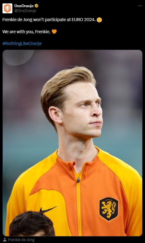 六月十一日,荷兰国家队正式宣布,德容因脚踝受伤无法及时恢复,将缺席今年夏天的欧洲杯。