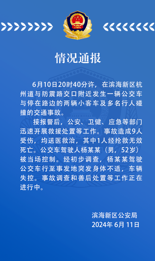 6月11日,微信公众号“安全天津滨海”发布了《警情通报》:6月10日20时40分左右,滨海新区杭州道与防震路交叉口周边发生一起交通事故,该事故与停在路边的两辆客车和多名行人发生碰撞。