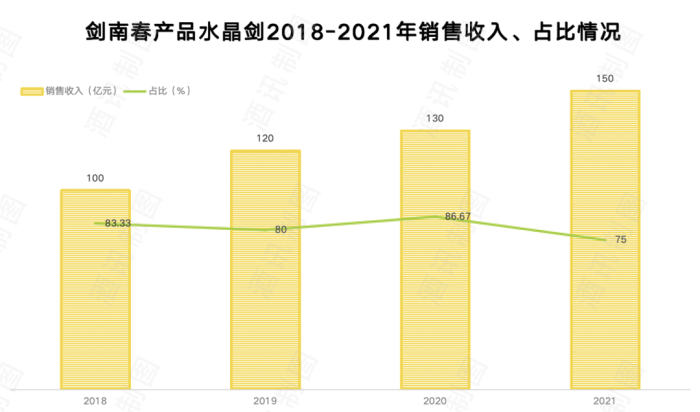 根据剑南春公司的披露,2018—2021年水晶剑分别实现销售约100亿元、超120亿元、130亿元以及150亿元,占总销售收入的83.33%、80%、86.67%、75%。