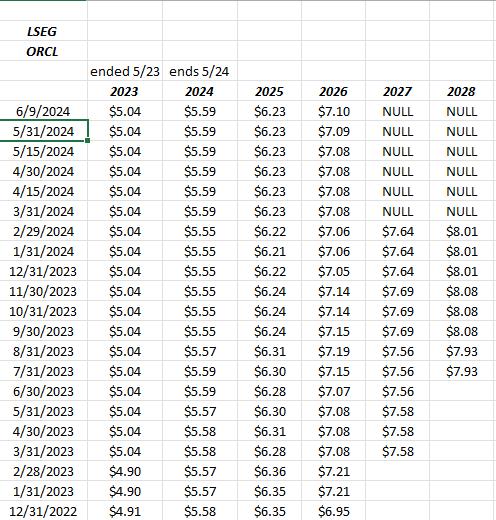 甲骨文的股价分别是24年和25年每股5.59美元和6.23美元的23倍和20倍,预计24年和25年的增长率分别为9%和11%。
