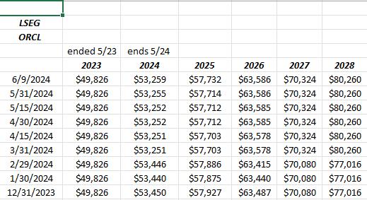 多年来,甲骨文股票的营业利润率一般在47%到50%之间达到峰值。在过去的三个季度,甲骨文的营业利润率分别为43.6%(2/24季度)、42.8%(10/23)和40.6%(8/23/23季度)。