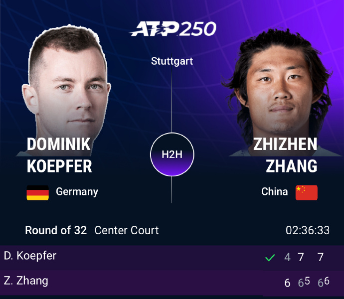 六月十日,ATP250斯图加特联赛男子单打首轮比赛,中国选手张之臻错过了6-4的比赛点。、6比7(5)、6-7(6)缺憾不敌本土作战的科普菲尔,无法晋升第二轮。